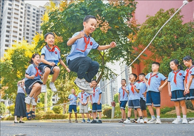 9月1日,湖南省永州市道县中小学、幼儿园迎来秋季开学。当日,道州玉潭(东阳)学校的小学生在参加大课间跳长绳活动。