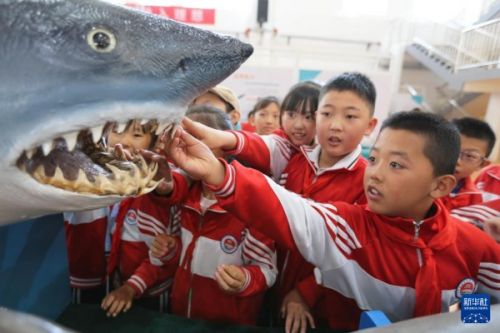 9月8日,在甘肃省定西市举办的“山海相依,筑梦蔚蓝”山东青岛·甘肃定西海洋科普东西部协作主题活动中,定西市安定区关川实验学校的学生在观看海洋生物标本。