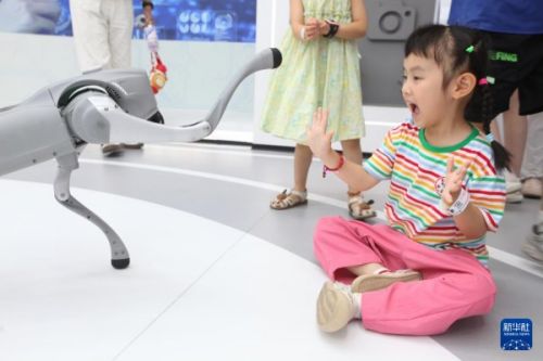 9月7日,在位于江苏省徐州市云龙区的一家科学探索馆,小朋友与机器狗互动。