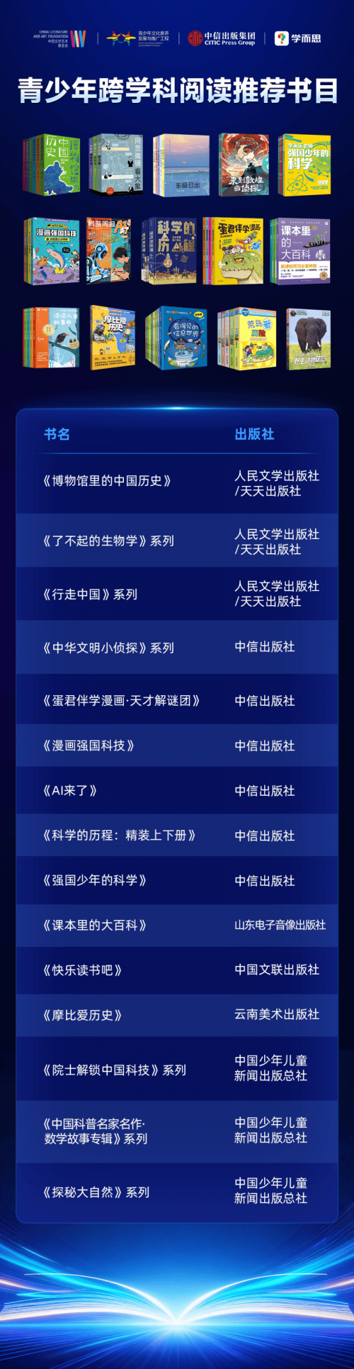 本次活动中,学而思与中信出版集团联合聚焦 “青少年跨学科素养出版物” 领域,开展深度合作。随着 “青少年跨学科阅读研究委员会”的成立,一批青少年跨学科阅读推荐书单也同时发布,当中包括《中华文明小侦探》系列、《强国少年的科学》和《漫画强国科技》系列、《AI来了》、《科学的历程》少年版等,跨学科阅读又有了新的助推力。