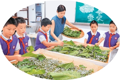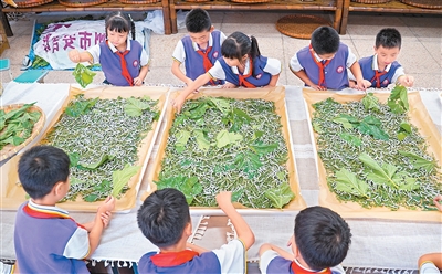 图为安吉县紫梅小学的“水驿蚕桑”课堂,小学生们给蚕宝宝喂食。