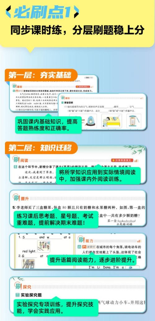 学霸告别“无聊刷题”,挑战更高思维——担心学有余力的孩子“没挑战”?每课专属的“刷素养”栏目就是“学霸专属加餐”!这里有锻炼思维的创新题、贴合考试新趋势的前瞻题,英语还搭配了热点时文阅读,既能拓展思维深度,又能对接更高学段要求,让学霸在探索中保持学习兴趣。