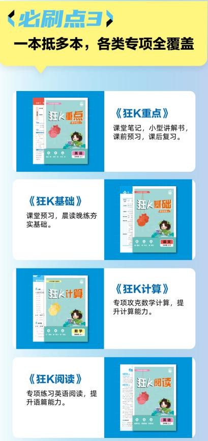中等生需要突破瓶颈,成绩稳步向上。主书的难度与题量既不重复简单题浪费时间,也不超纲为难孩子,刚好能在巩固基础的同时,稳步提升能力。再加上《狂K阅读》《狂K难点》《狂K重点》等专项插册,针对性解决阅读理解、数学重难点等“提分拦路虎”,助力孩子突破成绩天花板。