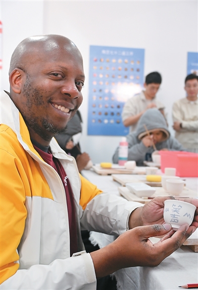 美国学生在学校非遗大师工作室体验手绘陶瓷。