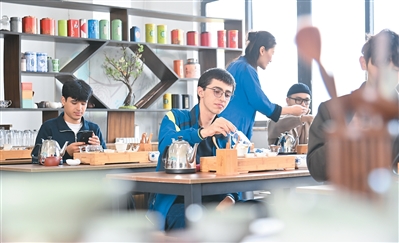 日前,在位于重庆市沙坪坝区的重庆建筑科技职业学院,外国留学生正在学习茶艺和书法。该校开展留学生“感受非遗魅力”主题活动,吸引了来自俄罗斯、哈萨克斯坦、乌兹别克斯坦、吉尔吉斯斯坦等7个国家的39名留学生体验茶艺、书法。