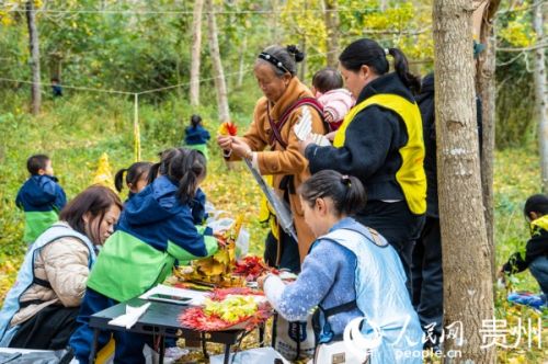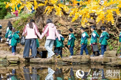 人民网盘州11月20日电 正值初冬时节,漫步于贵州省六盘水市盘州市妥乐村,一树树金黄的银杏挺立在村寨之中。微风拂过枝头,将片片银杏叶轻送至屋檐下、村路旁。前来开展游学活动的师生们俯身拾起落叶,精心制作成各式银杏摆件——这不仅是自然赠予的礼物,也成为他们把课堂搬进大自然最生动的见证。在妥乐村,这样别开生面的生态文化游学课程,已成为一道常态化的风景。