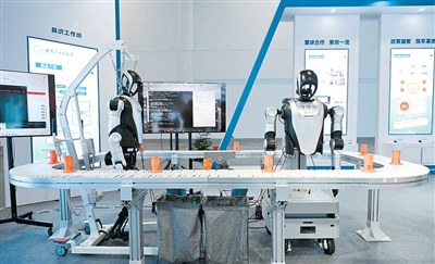 中国侨智发展大会“侨智汇”成果发布区拍摄的自动分拣机器人。