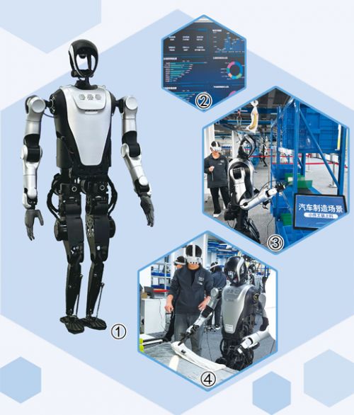 在训练中心“学习”的主力机型是身高1.66米的“夸父”人形机器人。“教学”方式为“小班制”,每台机器人配备两名训练师。