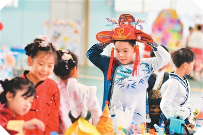 近日,山东省青岛市市北区福州路小学开展传统文化体验活动。孩子们通过学习制作泥塑、绒花、扎染、竹编等,体验非遗之美,传承中华优秀传统文化。图为一名学生在试戴状元帽。