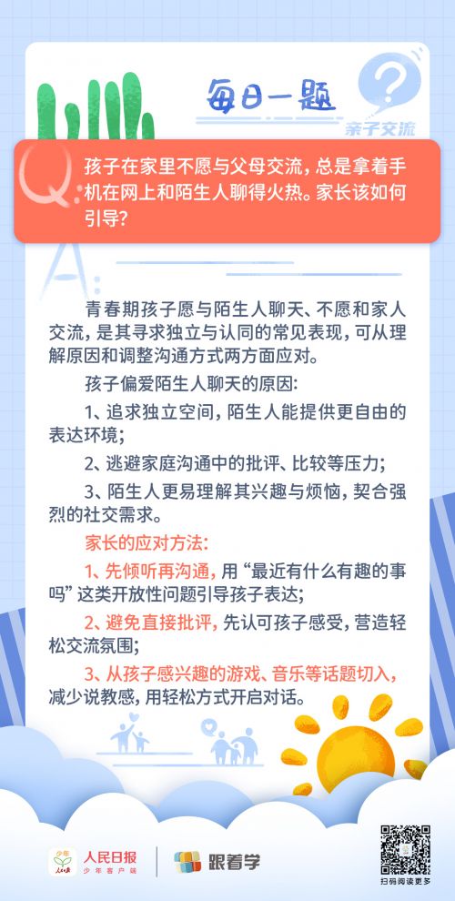 每日一题丨孩子不与家人沟通,却总在网上和陌生人聊天。家长该如何引导?