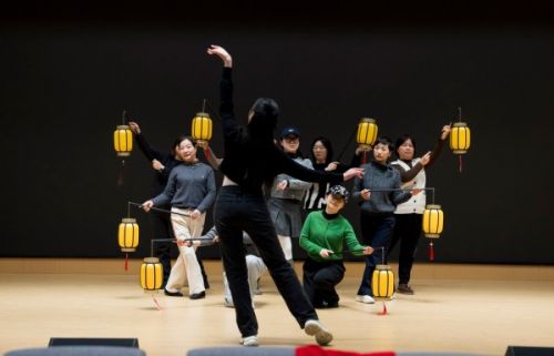 1月19日,在苏州市工人文化宫的多功能厅,企业职工在舞蹈老师带领下排练年会舞蹈。