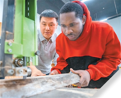 近日,在浙江广厦建设职业技术大学工艺美术学院里,10余名非洲留学生参加了家具结构技术实训课。教师金鸿良向学生们讲授材料特性、开料、机器使用、家具特征、榫卯工艺等工序内容,学生们分批尝试开料、打磨等步骤。