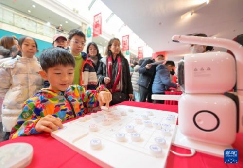 1月24日,在天津市少年儿童活动中心,一名小朋友在娃娃庙会上与机器人下象棋。