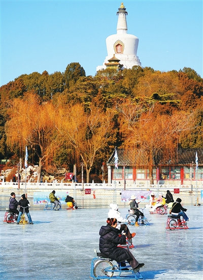 图为人们在公园冰场上骑冰车,乐享冬日时光。