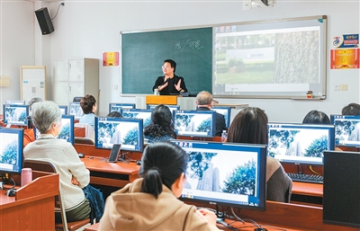 重庆市渝北区,重庆市老年大学为老年学员搭建了终身学习平台,他们在此以艺术点亮生活,用知识充实自我,展现“银龄”人生的无限精彩。图为摄影创作课上,银龄学员学习摄影知识。