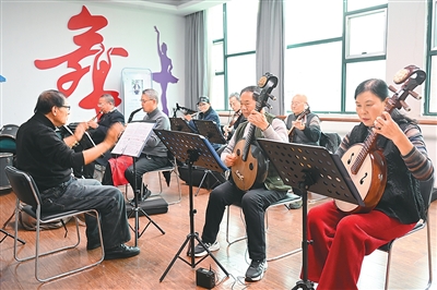 近年来,河南省漯河市源汇区在社区开办老年大学公益课堂,为老人传授音乐、舞蹈、书法、绘画等技艺,让老人们真正实现老有所乐、老有所为。图为源汇区马路街街道八一路社区,老年音乐爱好者在演奏乐器。