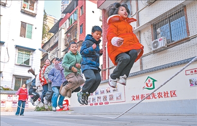 四川省眉山市仁寿县文林街道先农社区的“童伴之家”,志愿者正在和孩子们一起玩游戏。