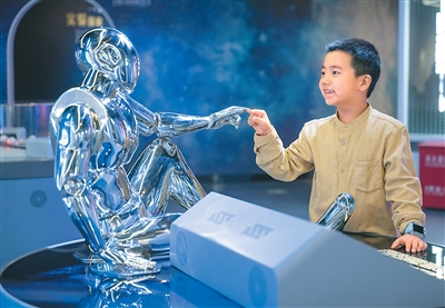 图为科技馆内一名小朋友通过触摸机器人模型手指触发观看关于镓基液态金属的相关科普知识。