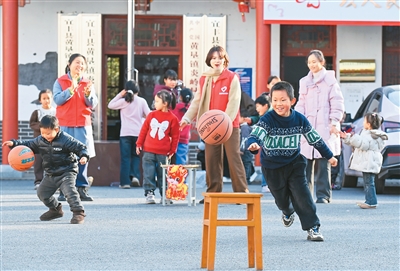 图为2月2日,在黄垦镇炎岭村新时代文明实践站,志愿者和孩子们一起做游戏。