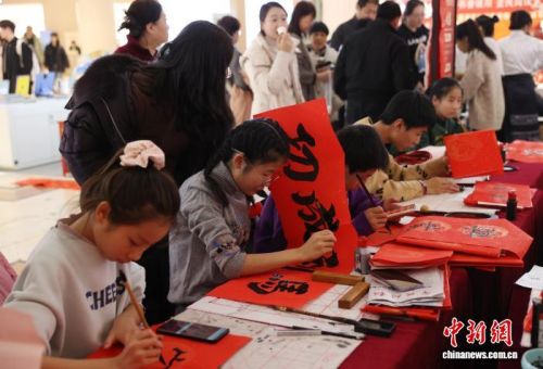 2月8日,“龙马精神迎新春 邻里团圆乐万家”宁夏新时代文明实践集中示范暨金凤区非遗过大年活动在银川市金凤区启幕。活动现场,孩子们纷纷提笔蘸墨,书写祝福,在浓浓的年味中迎接马年的到来。图为小朋友写春联。中新社记者 于晶 摄