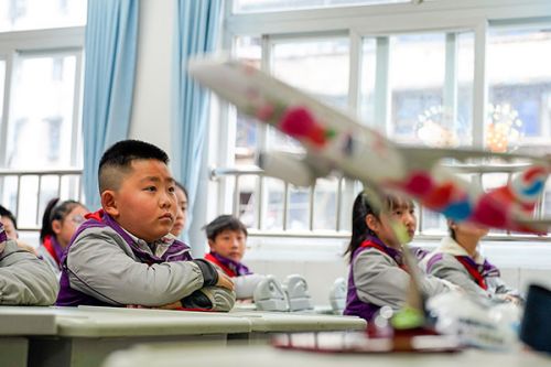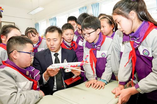 3月5日,在重庆市九龙坡区谢家湾朵力小学校的课堂上,来自重庆航空的飞行员李蒙邑用飞机模型向学生们讲解飞行原理。