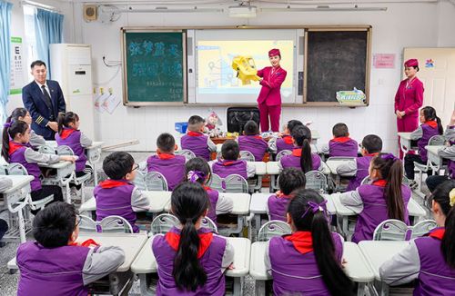 3月5日,在重庆市九龙坡区谢家湾朵力小学校的课堂上,学生们在听重庆航空的空乘人员讲解民航安全知识。