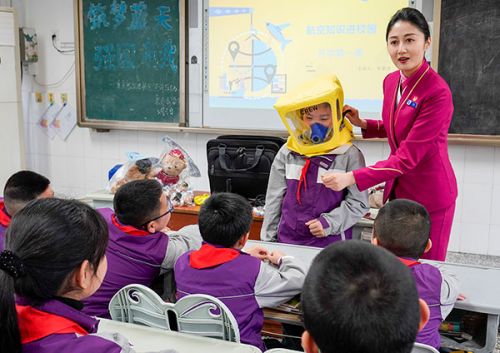 3月5日,在重庆市九龙坡区谢家湾朵力小学校的课堂上,来自重庆航空的空乘人员和学生一起演示如何正确使用客机上的应急处置装备。