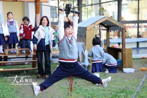 2026年3月11日,浙江金华磐安县实验幼儿园,小朋友们在户外活动场进行搭积木、打羽毛球、玩滑索等自主游戏。陈强摄(人民图片网)
