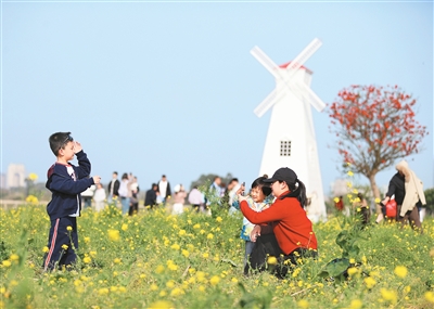 近日,福建省厦门市翔安区西岩山都市田园千亩油菜花盛开,成为市民游客出游好去处。图为市民在花田里拍照打卡。