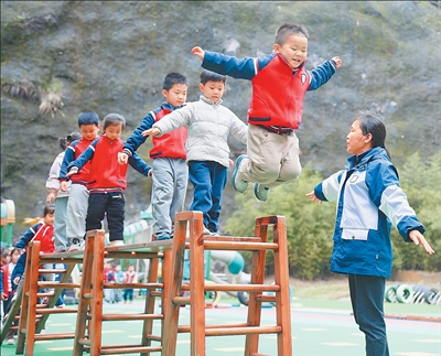 4月7日,湖南省怀化市通道侗族自治县盛世侗乡幼儿园,孩子们在大课间参加户外游戏。