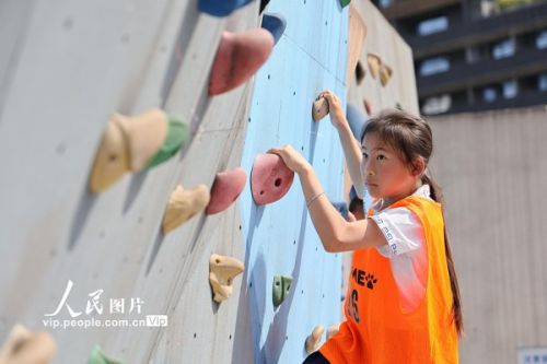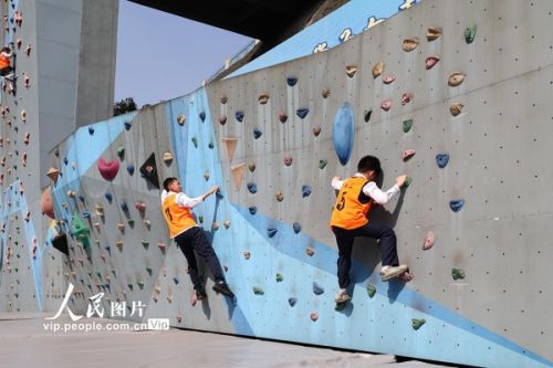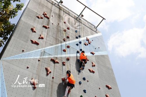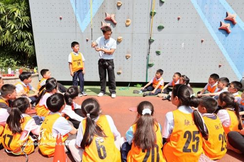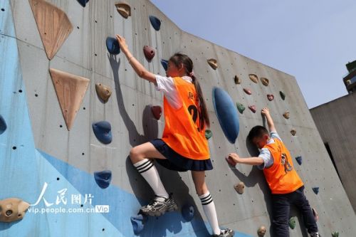 2026年4月17日,重庆市融汇沙坪坝小学,学生在校内攀岩基地练习攀岩。近年来,该校依托依山而建的地理优势,打造校内攀岩训练基地,将攀岩设为户外运动校本课程的核心内容,学生全员参与并按年龄段自主选课。攀岩不仅锻炼学生的协调性与平衡感,更培养其勇敢坚韧、敢于挑战的意志品质,实现体育与德育的深度融合。孙凯芳摄(人民图片网)